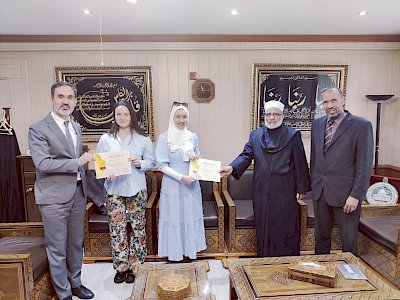 Teachers Ruth Everard and Eileen Scanlon were presented with certificates of attendance today by Sheikh Hussein Halawa, ICCI CEO Mr Ahmed Hasain and Dr Ali Selim. They took part in an online course on Islamic Studies for teachers, taught by Dr Ali Selim. This course was accredited by the Irish Council of Imams and was designed for pre-service and in-service teachers.