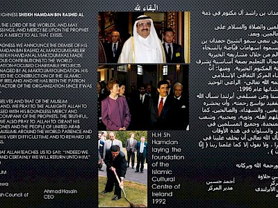 It is with a great sadness we announce the demise of His Highness Sheikh Hamdan Bin Rashid Al Maktoum earlier today in Dubai. Sheikh Hamdan Al Maktoum has made enormous generous contributions to the world through his Education-focused charitable projects overseen and managed by Al Maktoum Foundation. His Highness sponsored the construction of the Islamic Cultural Centre of Ireland and he has been the patron and the sole benefactor of the Organization since it was established in 1996.