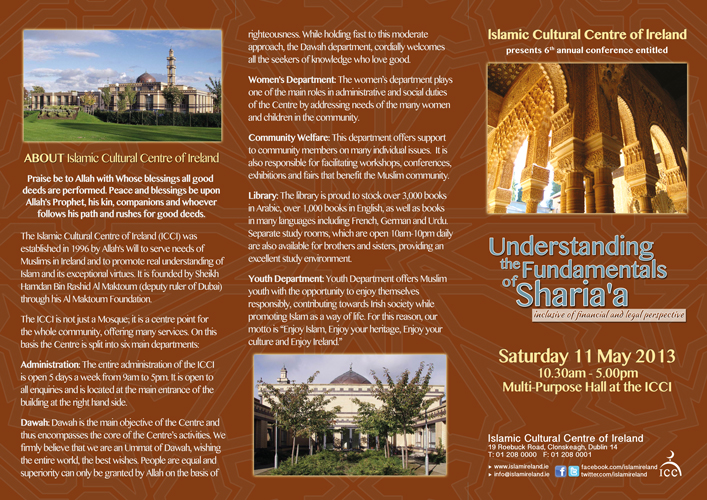 The Islamic Cultural Centre of Ireland is delighted to present the 6th annual conference entitled “Understanding the Fundamentals of Sharia’a: Inclusive of financial and legal perspective” on Saturday, 11 May 2013, for one day only commencing at 10.30am.