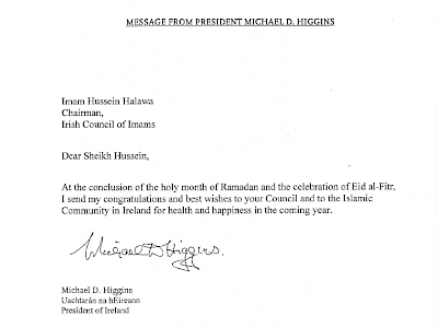 On behalf of the Irish Council of Imams, we are delighted and grateful to receive the good will message for Eid ul-Fitr from the President Michael D. Higgins for all the Muslims in Ireland.