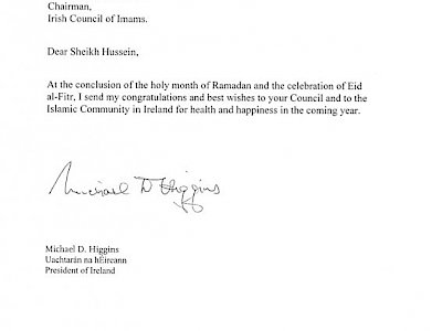 On behalf of the Irish Council of Imams, we are delighted and grateful to receive the good will message for Eid ul-Fitr from the Irish President for all the Islamic Community in Ireland.