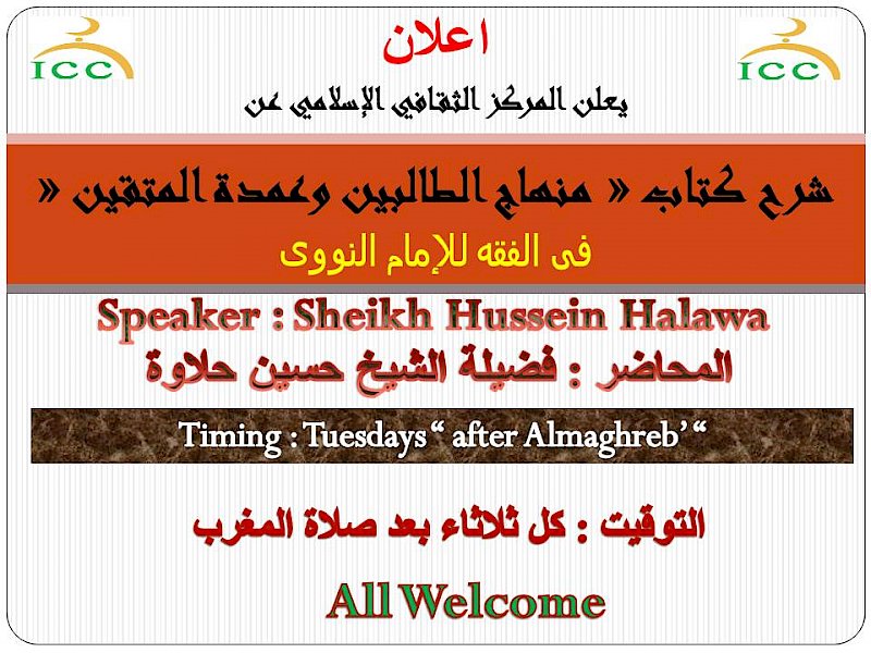 The ICCI presents Fiqh Lessons with the ICCI Imam, Sheikh Hussein Halawa, every Tuesdays after Maghreb Prayer. He will teach the book of Minhaq altalebeen wa omdat Almotaqeen. The lessons are open to all and are FREE.