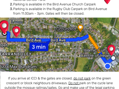 If you arrive and the ICCI gates are closed, do not park on the green crescent or block neighbours driveways. Do not park on the cycle lane outside the mosque railings/gates. Go and make use of the legal parking zones mentioned above.