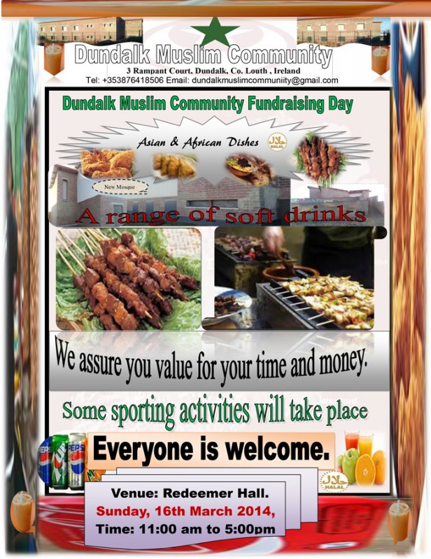 Thousands of euros are needed to own the mosque and in order to fundraise for that purpose, the Dundalk Muslim community is holding a fundraising event on Sunday 16th March 2014 from 11am-5pm at the Redeemer Resource Centre, Dundalk, Co. Louth.