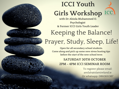 As part of the senior girls youth club the youth department has organized a wellness workshop with Sr Abiola on October 30th in the seminar room from 2pm - 4pm. Sr Abiola was our previous ICCI youth leader/girls youth co-ordinator and is now a qualified psychologist mashaAllah. The workshop is titled "Keeping the Balance", and the focus will be on finding the balance between prayer, studies, and life in general.