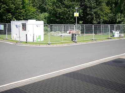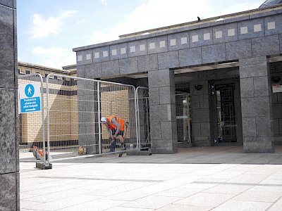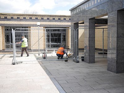 The builders have set up on the green area to the front of the main entrance. There are safety signs around the area. The main entrance will be blocked/sealed and not be usable for the duration of the work. People will need to access the prayer hall from the side entrances.