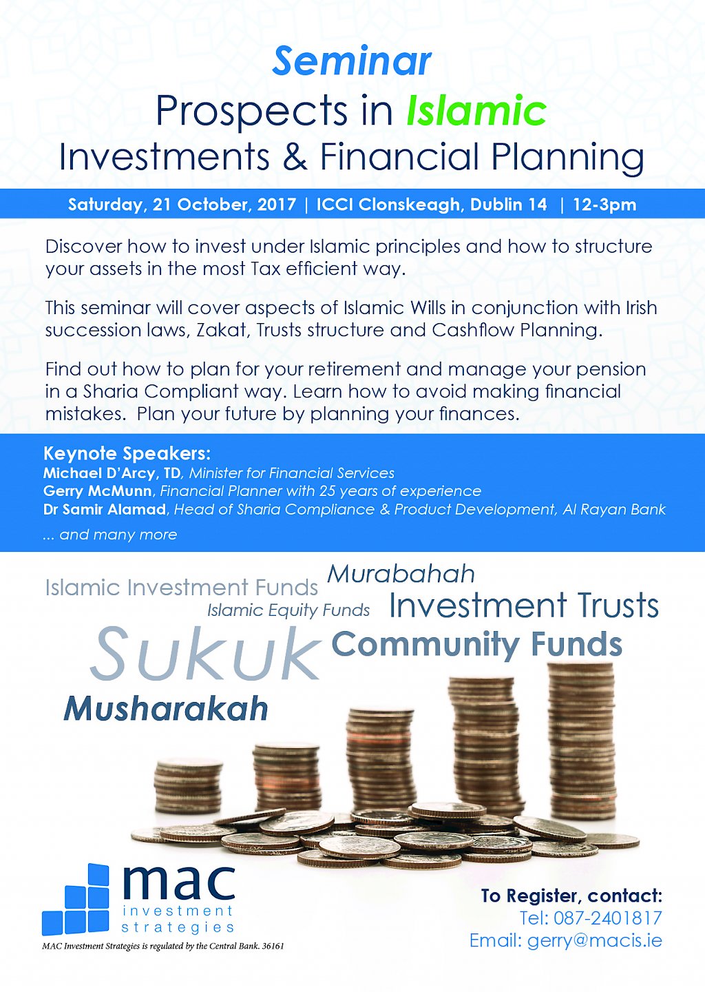 ICCI in co-operation with MAC Investment Strategies is pleased to announce the Seminar on “Prospects in Islamic Investments & Financial Planning” on Saturday, 21 October from 12-3pm. This seminar will cover aspects of Islamic Wills in conjunction with Irish succession laws, Zakaat, trusts structure and cashflow planning.