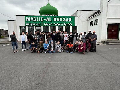 The Road Trip continued to the small town of Ballyhaunis where the first purposely build mosque as a mosque was established back in year 1988. The “Al-Kausar” Mosquе build and established by the late brother the businessman Sher Mohammed Rafique who started Halal Meats in Ballyhaunis (may Allah have mercy on him), surprised us with its unique and charming design. At that time in Ireland there were other mosques, however they were all existing buildings converted as mosques. It is part of the interesting history of Muslim presence in Ireland. Again we were warmly welcomed by Brother Muhammad Cherbatji (a member of the management board), who narrated the story behind the Mosque, the Muslim community in Ballyhaunis and at the end looked after us with a tasty pizza.