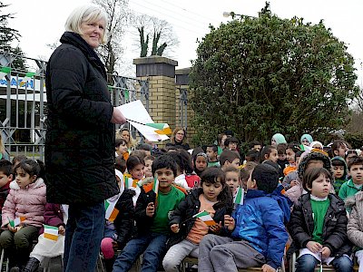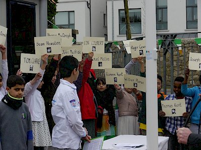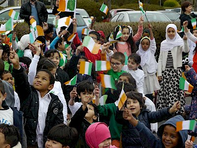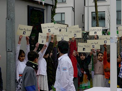 The execitement was palpable as the Irish tricolor was raised and a reading of the school's Proclamation for a New Generation, which sets out the vision and ideals of the Generation of 2016. This was followed by spirited rendition of Ireland's National Anthem. Sixteen students held up the names of the 16 leaders of the 1916 Rising. All the primary schools in the country received their copies of the Proclamation and the national flag from members of the Defence Forces over the last six months. Arts Minister Heather Humphreys described Proclamation Day as a once in a generation occasion and a culmination of months of work by teachers, parents and pupils, who had "so eagerly embraced the Ireland 2016 Centenary Programme".