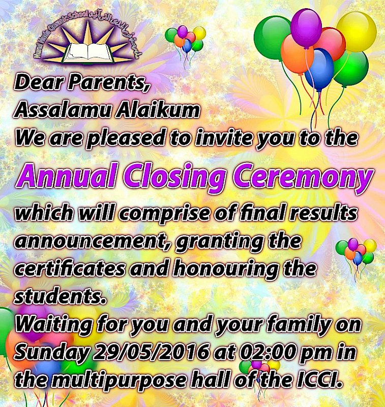 Dear parents, we are pleased to invite you to the Annual Closing Ceremony, which will comprise of the final results announcement, granting the certificates and honouring the students.