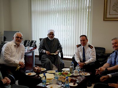 The Islamic Cultural Centre of Ireland; CEO Dr. Nooh, Imam Hussein Halawa, Mr. Ahmed Hassain (Director of Administration & Finance) and Sr. Summayah Kenna (Head of Community Welfare Department & Member of ICCI Public Relations Team) were delighted to officially welcome Supt. Timothy Burke (Donnybrook & Irishtown Station) and Sergeant Darragh Lynch (Irishtown Station) earlier today, on their first visit to the ICCI. Beneficial discussions were held during the visit while enjoying a humble breakfast in the CEO's office.