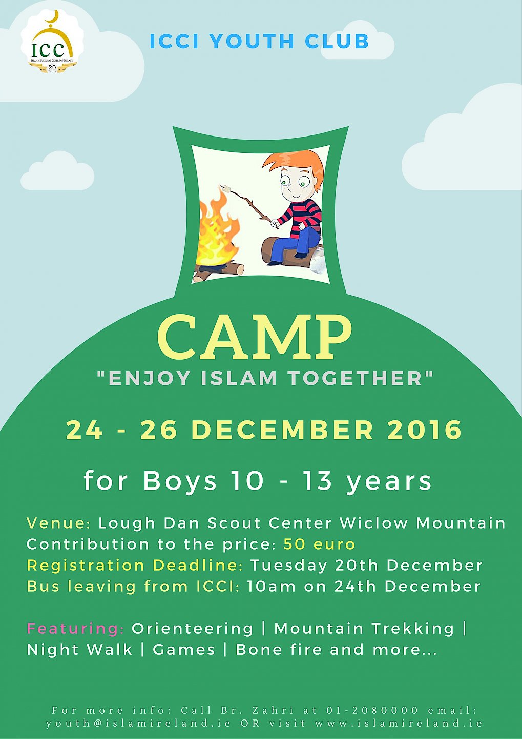 The Youth Department of ICCI is pleased to announce the next challenge for boys 10 – 13 years, with an Outdoor Adventure Camp. The Camp will take place at the Lough Dan Scout Centre. The theme of the Camp is “Enjoy Islam Together”.