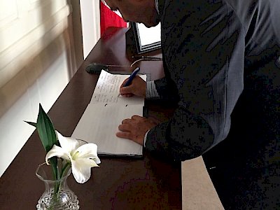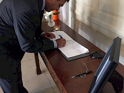 Pictures below: On behalf of the Islamic Cultural Centre of Ireland, Mr Shaheen Ahmed signs the Book of Condolences in the Mansion House in Dublin.