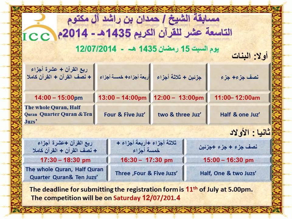 The ICCI is pleased to announce on the nineteenth Qur’anic Competition - Ramadan 1435 , sponsored by Sheikh Hemdan Ben Rashid Al-maktoom. The competition will be running in the following categories: The whole Qur’an, Half Qur’an, Ten Juz’ ,Quarter Qur’an, Five Juz’, Four Juz’, Three Juz’, Two Juz’, one Juz’ and half Juz’.