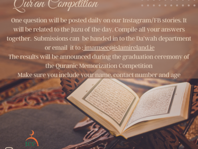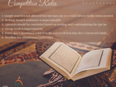 Submissions of the answers to the questions can be handed into Sheikh Eid in the Da'wah department or emailed to [email protected] Deadline for submissions is the 13/04/2024