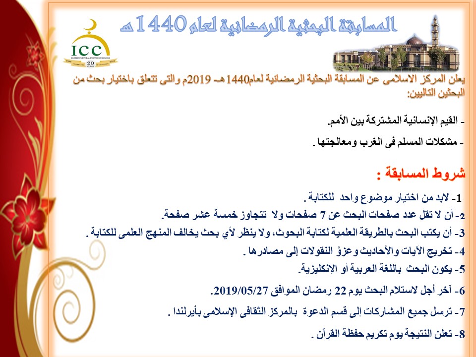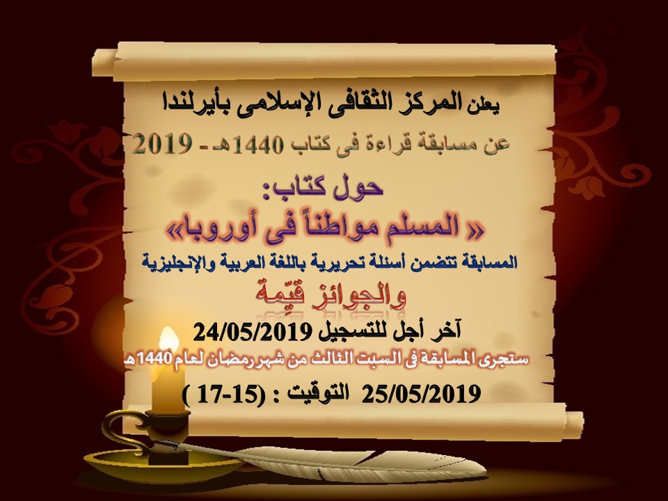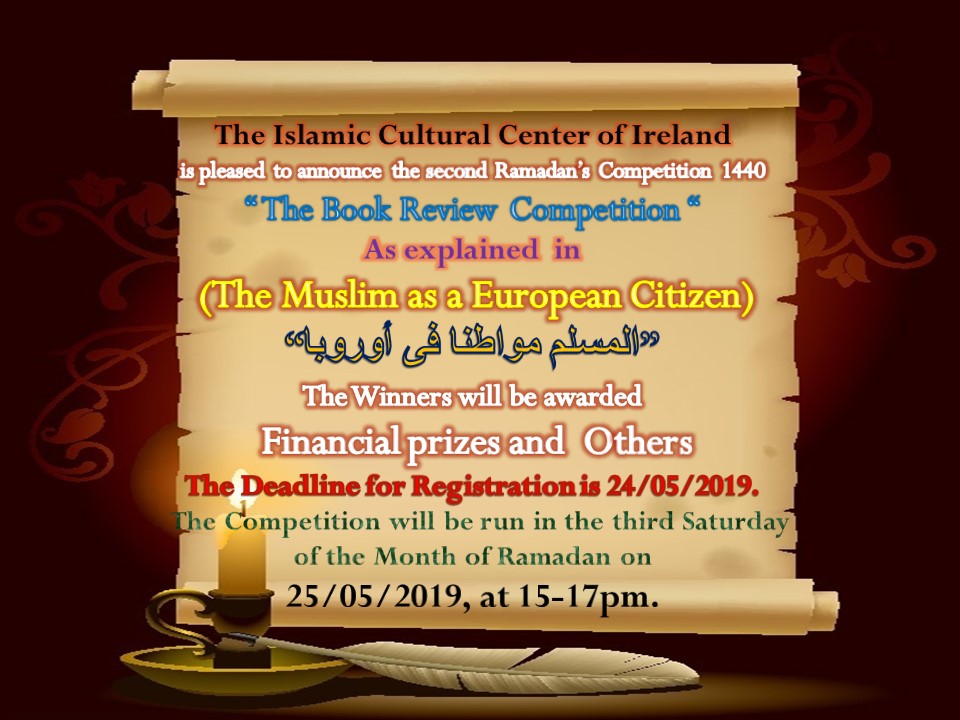 Islamic Cultural Centre of Ireland has pleasure to announce the second Ramadan Book Review Competition 1440/2019. The book is The Muslim as a European Citizen. The competition will run on 3rd Saturday of Ramadan - 25th May, 15:00-17:00 hours.