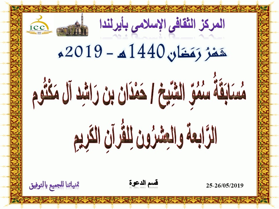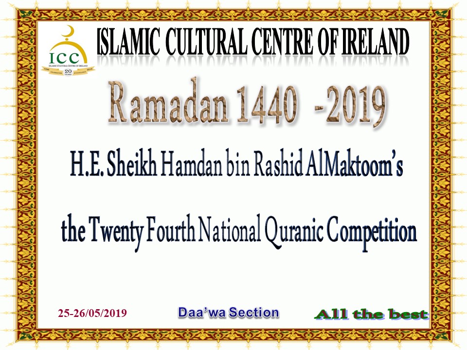 The 24th Almaktoum Qur’anic Competition is on Saturday, 25th May for Dublin participants and on 26th May for all others. Categories are as follows: Half JUZ’, One JUZ’, Two JUZ’, Three JUZ’, Four JUZ’, Five JUZ’, Quarter of the Quran, Ten JUZ’, Half of the Quran, The Whole of Quran. For the timetable please check the attachments.