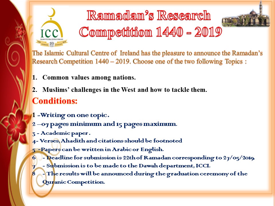 The Islamic Cultural Centre of Ireland is pleased to announce Ramadan Competitions for 2019. Enroll by using the online form below, or alternatively download the PDF form and bring to ICCI.