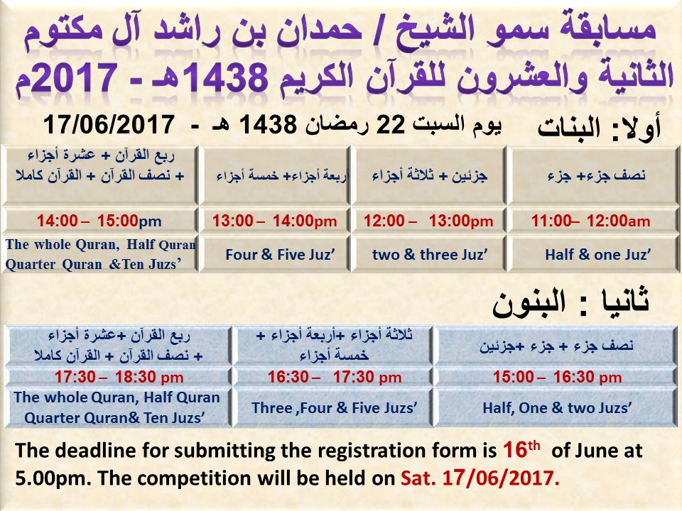 The 22nd Almaktoum Qur’anic Competition is on Saturday, 17th June for Dublin participants and on 18th June for all others. Categories are as follows: Half JUZ’, One JUZ’, Two JUZ’S, Three JUZ’S, Four JUZ’S, Five JUZ’S, Quarter of the Quran, Tenth of Quran, Half of the Quran, The Whole of Quran. For the timetable please check the attachments.