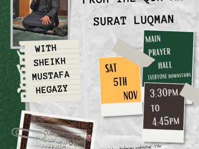 The ICCI Youth Department invites you to our upcoming talk with Sheikh Mustafa Hegazy. He will be taking us through one of the beautiful stories from the Qur'an in Surat Luqman on Saturday 5th of November at 3:30pm in the Main Prayer Hall, InshaAllah.