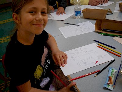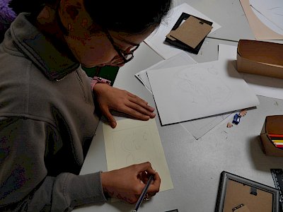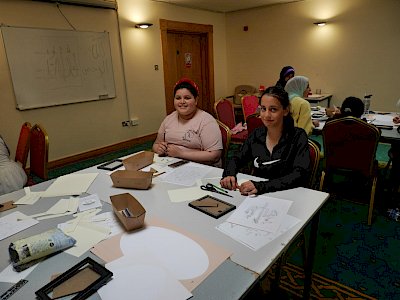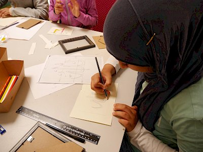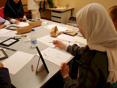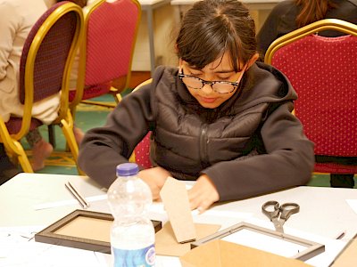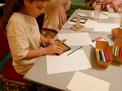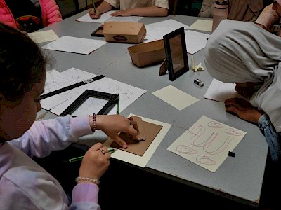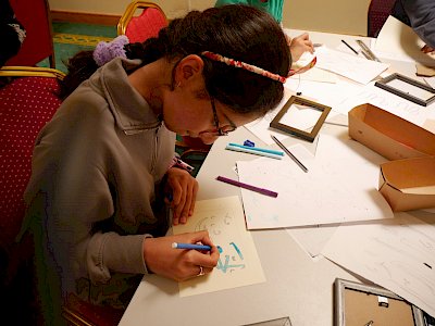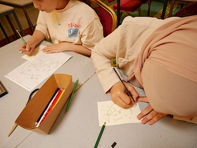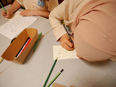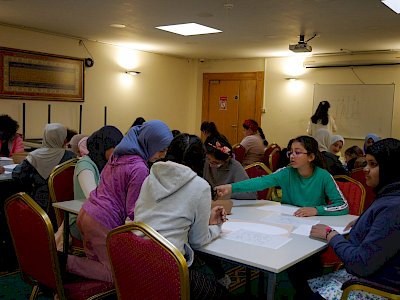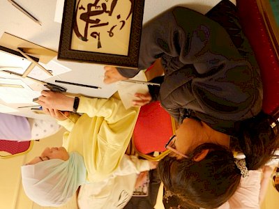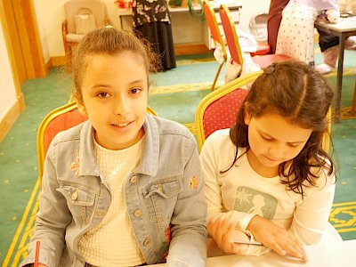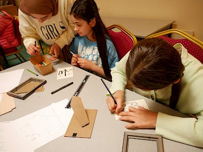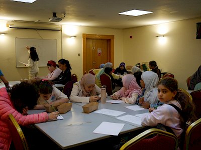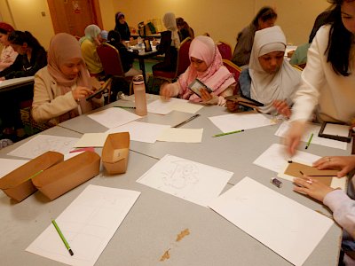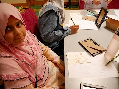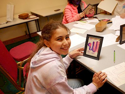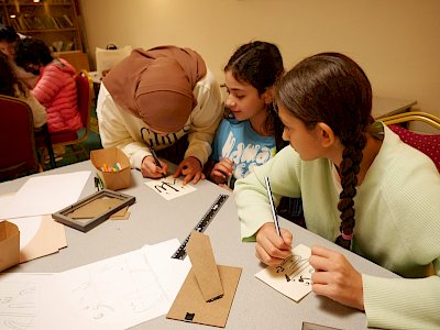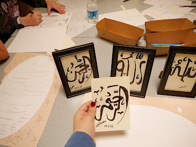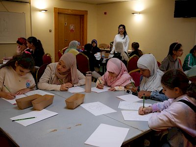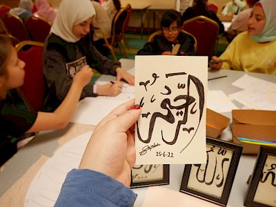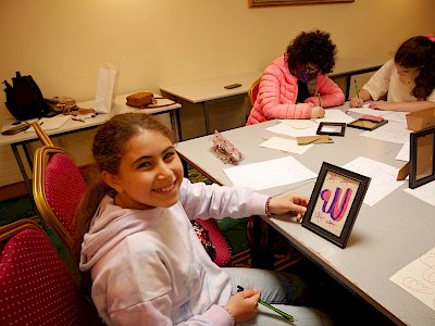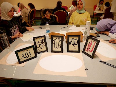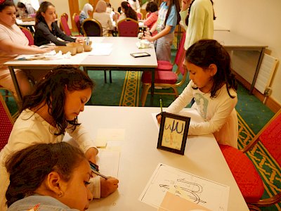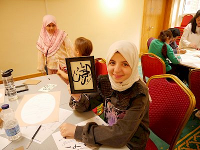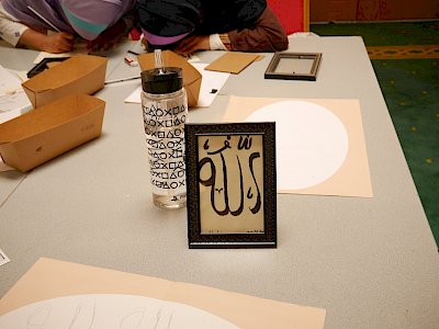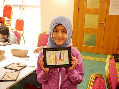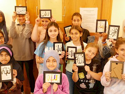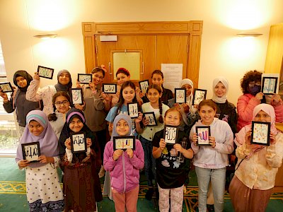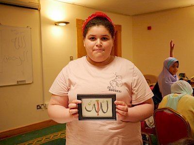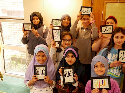 The Junior Girls Youth Club had a very successful and fun calligraphy lesson on Saturday 25th of June. We had the pleasure of Allaa and two volunteers Az-Zahraa and Diyora helping the girls to make beautiful calligraphy pictures of the names of Allah (swt). The girls practiced first and then did their final piece on a smaller page to place into a small black frame to bring home.