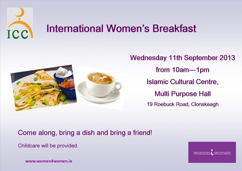 Islamic Cultural Centre of Ireland and Women4Women would like to invite you the next International Women’s Breakfast at ICCI on Wednesday 11th September 2013 from 10.00- 1.00pm. The event will take place in the Multi-Purpose Hall in the Centre. Please come along and do not forget to invite your friends and family. We really appreciate if you could contribute by bringing a dish.